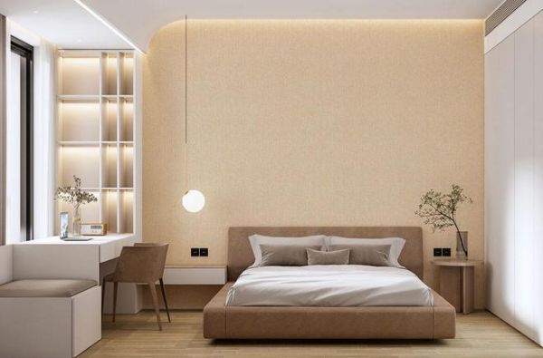 卧室同样选择了天洋墙布45#TM系列,浅棕色调性温暖柔和,点缀金属设计,让空间更富有腔调。墙布、床等大地色系的暖调色彩,与木质家具更好的融合在一起,让卧室富有自然和生机,给人以安静、抚慰的空间效果。