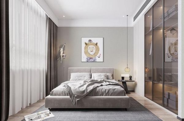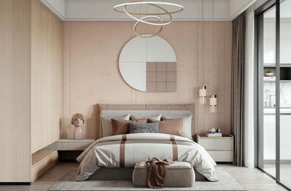 除了暖色调外,浅冷色调也是很好的选择,更多的强调卧室的静谧感,天洋墙布的材质特性也让空间,在清冷之余再添温馨。嵌入衣橱设计,与整体遥相呼应,节省空间的同时也让空间尽显轻奢气质。