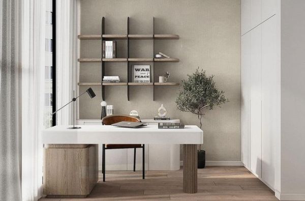 书房选择了富有肌理感的灰色系墙布,让空间更适合工作学习,延续了客厅、卧室的肢体质感,营造空间的连续感。极简的书架,让空间通过线条感更彰显个性。落地窗的设计让居者能够在工作的同时欣赏风景,舒缓心情,更让空间通透,视野广阔,简约大方。