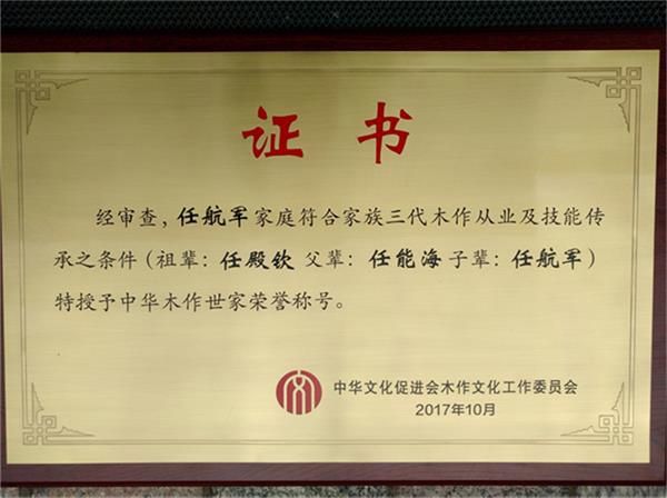 多年来,任航军在古建木作行业深耕,经过不懈努力,在2017年,任航军家族被中华文化促进会木作文化工作委员会授予"中华木作世家"荣誉称号,这是对整个家族的荣誉及肯定。