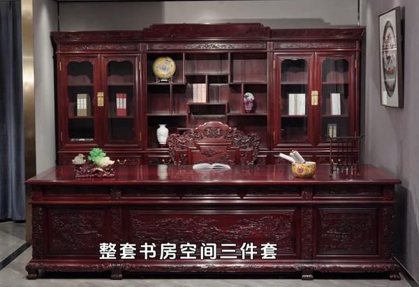豪华满雕山水书房空间:三米二长的书案如展开的江山图卷,深浅浮雕交织出立体的水墨意境。落地式的箱体沉稳厚实,主箱体一分为三,雕出鳞次栉比的山川流水、亭台楼阁、奇花异草,琳琅满目。书椅为宝座形制,搭脑非常宽大,在中部和两侧以祥云为底纹,雕出神兽奇观,非常大气。书柜上方造出飞檐造型,均雕出山水楼阁,中部为开放式展示架,两侧玻璃门开合,使整体装饰感更强,下侧同样是满雕的开合柜,使用的主体皆为山水奇观。这套集实用、收藏、传世于一体的书房臻品,将文人雅士“不下堂筵、坐穷林泉”的理想照进现实。