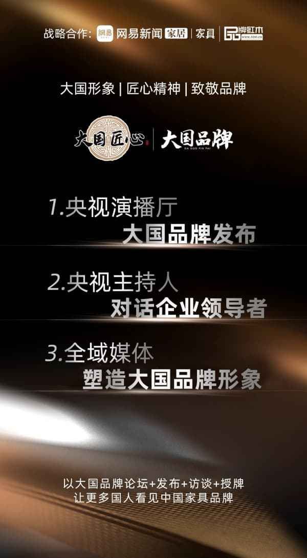 2025年《大国品牌》活动,不仅是一场行业盛典,更是一次文化宣言。让我们共同期待,《大国品牌》栏目携手中国家具行业的精英们,进一步推动行业从“产品输出”迈向“文化输出”,提升“国货”品牌影响力,树立传统工艺与现代品牌融合的典范,推动中国品牌矩阵的整体发展。