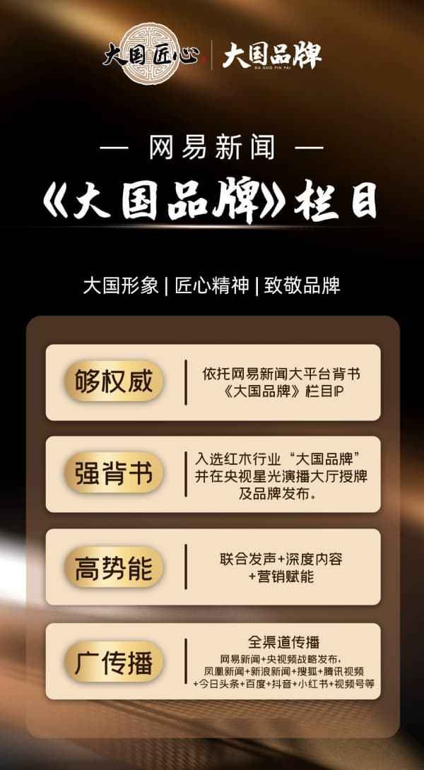 自2017年“中国品牌日”设立以来,品牌之力就成为了国家软实力的重要象征。2025年,在第九个中国品牌日来临之际,由品牌红木联合网易新闻家居家具,与全联民间文物艺术品商会艺术红木家具专业委员会共同策划打造《大国品牌》栏目,并计划在央视演播厅举行发布活动,它不仅是家具品牌企业家的思想盛宴,更是中国家具行业共商品牌战略的平台。