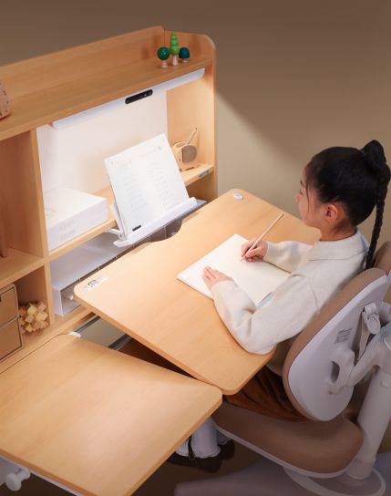 心理学家指出,固定的学习区域能激活大脑的“情境记忆”,让孩子快速进入专注状态。光明园迪学习桌椅通过科学分区设计(如磁吸挡书条、多功能阅读架),打造“沉浸式学习空间”,减少文具翻找时间,提升学习效率。其“小C口”弧形桌面延伸7厘米,让孩子双肘自然下垂,躯干前倾角度减少,脊柱压力降低,从物理层面减少疲劳感,延长专注时长。