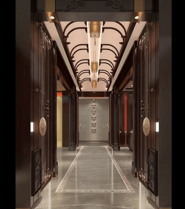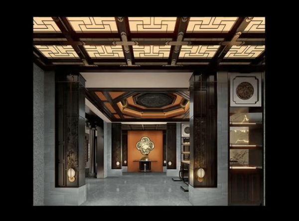 走廊吊顶采用井口天花设计,嵌万字纹棂格