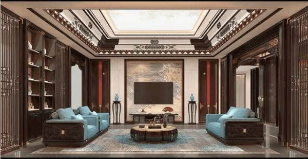 背景墙两侧,装饰鱼鳞纹落地花窗