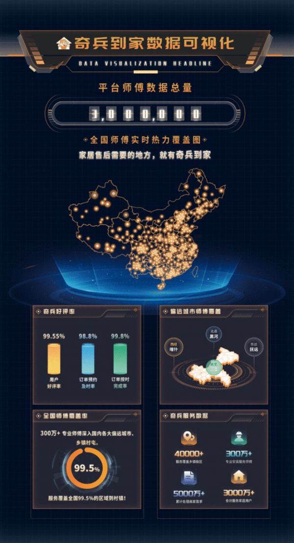 售后服务一旦出现延误,将直接导致消费者购物体验大打折扣,进而引发投诉、退货、差评等一系列连锁反应,损害店铺苦心经营的口碑。在这样的关键节点,奇兵到家凭借其在服务区域覆盖上的卓越优势,成为家居商家的坚实后盾。平台历经9年深耕细作,已构建起一张广泛且坚韧的服务网络,目前国内有41356个乡镇街道单位。当前奇兵到家平台师傅覆盖,已经超过41162个乡镇,覆盖率达99.5%。无论是繁华的一线城市,还是遥远的偏远乡镇,都能迅速响应商家的紧急需求,就近精准安排专业师傅上门服务,确保售后服务高效、及时、精准送达。