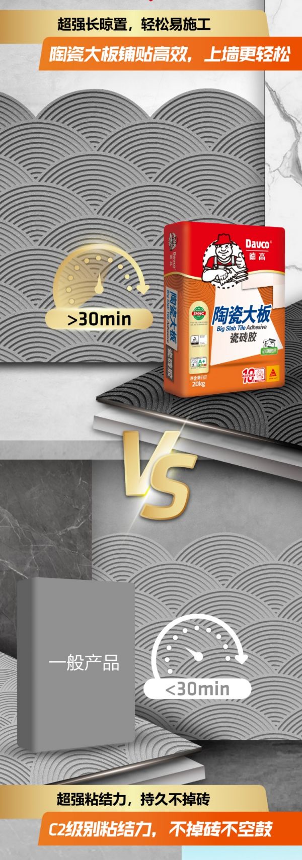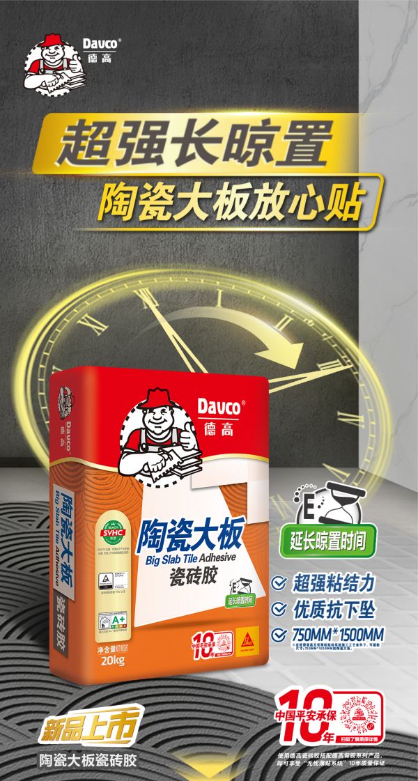 因此推荐使用德高陶瓷大板瓷砖胶。规范工艺下,这款瓷砖胶可铺贴尺寸≤750x1500mm的陶瓷大板。其有C2级超高粘结力,牢牢抓住大板,抗下坠能力好。