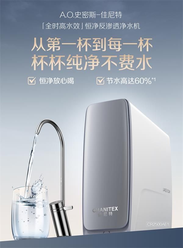 A.O.史密斯-佳尼特「全时高水效」恒净反渗透净水机,搭载“全程净水回流冲洗+净水循环过滤节水技术”,首杯水、杯杯水皆纯净可饮用,完美应对全国各地不同水质的复杂环境,带来恒净与节水兼得的全新升级体验,重新定义橱下净水机“恒净、节水、长效”新标准。