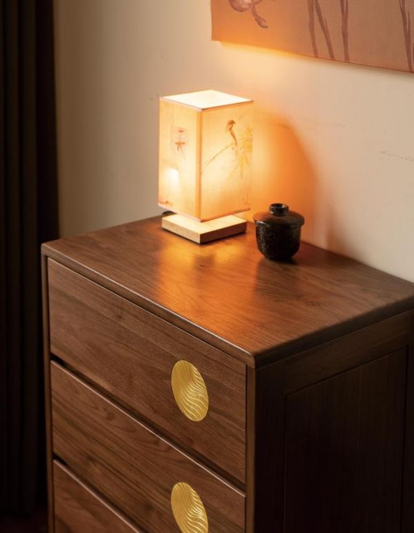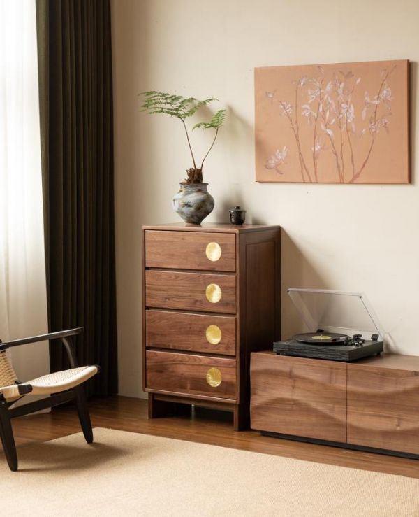 鎏金斗柜精选FAS级黑胡桃木,木纹细腻如流水,色泽沉稳深邃。产品设计巧妙平衡传统与现代,适配新中式、轻奢、侘寂、复古等多种风格,四层抽屉设计兼顾实用收纳与空间美学,可灵活适配卧室、客厅、书房等多场景需求——收纳贴身衣物、陈列茶具书籍,或作为玄关点睛之笔,皆能为居所注入艺术气息。