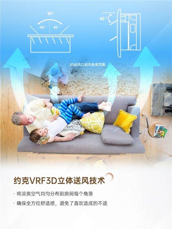 传统空调直吹带来的 "空调病" 困扰,本质上是气流组织不合理的产物。约克 VRF 的 3D 立体送风技术从仿生学中汲取灵感,采用翼型导风叶片设计,实现上下 0-60°、左右 - 45°-45° 的自由摆动,构建出环抱式的立体气流场。针对不同使用场景,系统具备智能风感调节功能:当儿童在爬行垫活动时,防直吹模式启动,利用天花板气流折射原理,使冷气如晨雾般自然沉降;老人午休时,微孔导风板将气流分解为无数微小气旋,实现 "有凉意无风感" 的极致舒适体验。这种对气流的精细化管理,不仅提升了体感舒适度,更从根本上改善了室内空气质量,让空调从单纯的制冷设备转变为健康生活的守护者。