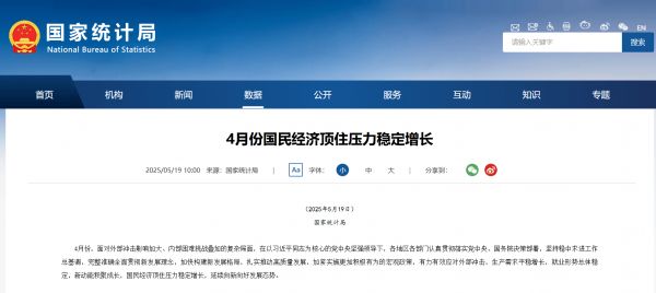 5月19日,国家统计局公布4月份国民经济数据。其中提到,4月份,社会消费品零售总额37174亿元,同比增长5.1%,环比增长0.24%。消费品以旧换新政策持续显效,限额以上单位家用电器和音像器材类、文化办公用品类、家具类、通讯器材类商品零售额分别增长38.8%、33.5%、26.9%、19.9%。