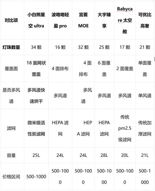 对比了市面上热门的6款婴儿消毒柜,其中小白熊灯珠最多,18面网状排布杀菌无死角,500-1000元区间最推荐小白熊星空ultra消毒柜,适合追求专业、安全,预算充足希望购买高端款式的家庭。Babycare和可优比容量最小,适合只需要消毒奶瓶奶嘴等小型物品、不追求专业消杀的家庭。