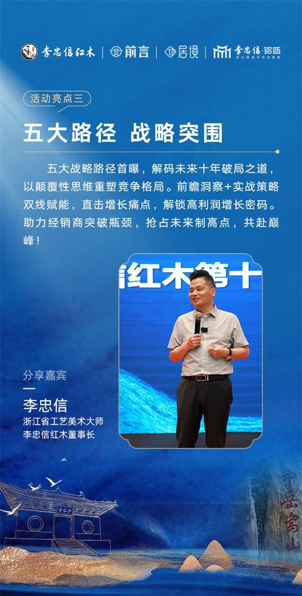 在充满不确定性的市场环境中,李忠信红木始终以“百年企业”的格局锚定航向。本届大会,浙江省工艺美术大师、李忠信红木董事长李忠信将以前瞻性视角剖析行业趋势,发布“五大战略路径”,每项战略将直击行业痛点。李忠信董事长将结合少林禅学中“刚柔并济”的智慧,阐释如何以“守正”夯实根基,以“破局”开辟新局。
