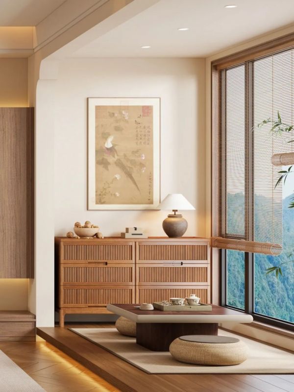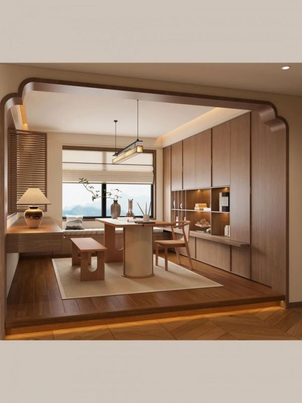 定制地台打造席地而坐的休闲区,六斗柜栅格门与木质定制柜的选择,勾勒出充满东方诗意的惬意角落。
