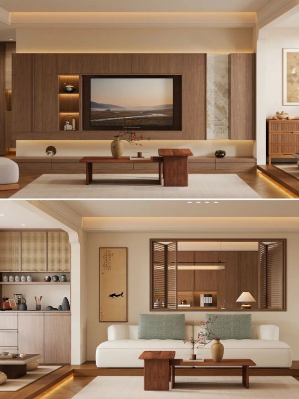 ① 悬空电视柜藏露有序,木质柜门与宋氏古画穿插搭配成趣,古朴感与轻盈感并存。