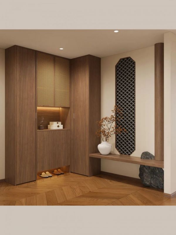 进门定制玄关柜,侘寂胡桃木纹与留白墙面形成深浅对比,内嵌暖光感应灯带,营造归家仪式感。墙面镂空造型引光入室,丰富层次,通透感与私密性完美平衡。