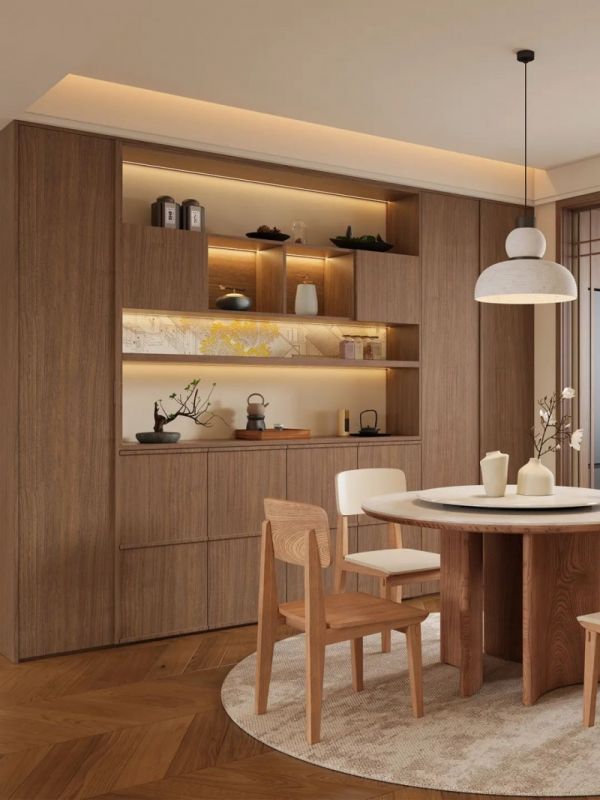 半开放式餐边柜设计,线条利落有序,骨骼线拉手质感升级;圆形餐桌配以古朴吊灯,营造出温馨且富有格调的用餐氛围。