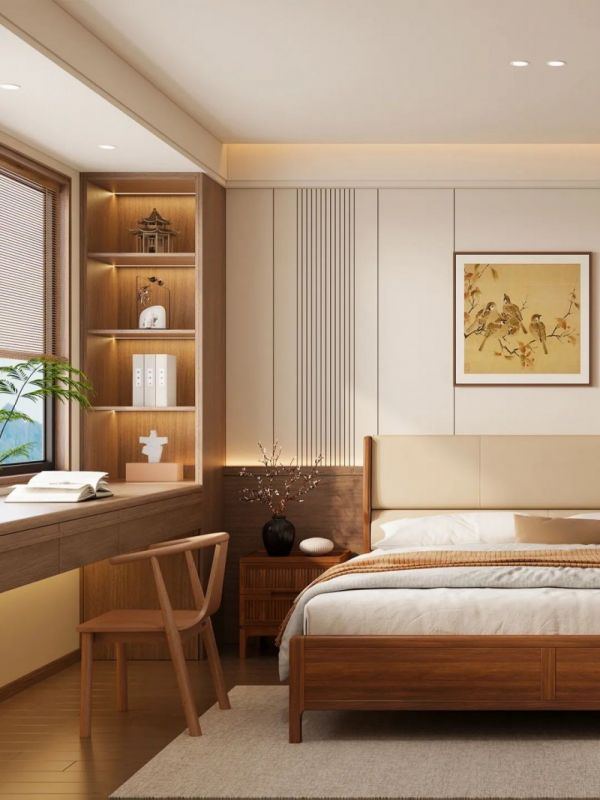 木饰面装饰床头,尽显典雅大气;靠窗定制收纳柜与台面,打造梳妆台和公区,实用与美感兼备。
