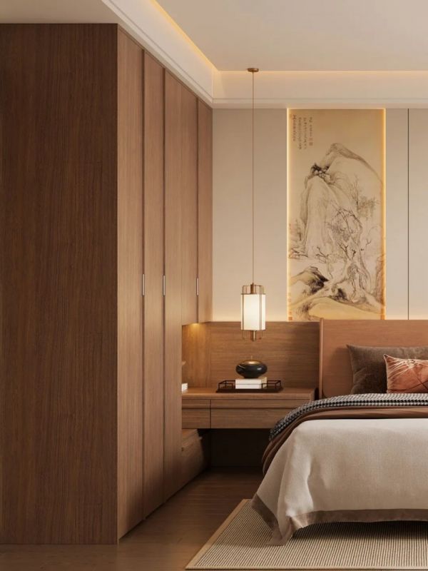 衣柜一门到顶,内侧延展出悬空台面打造床头柜;背景墙内嵌水墨画与灯带,让空间充满艺术气息。