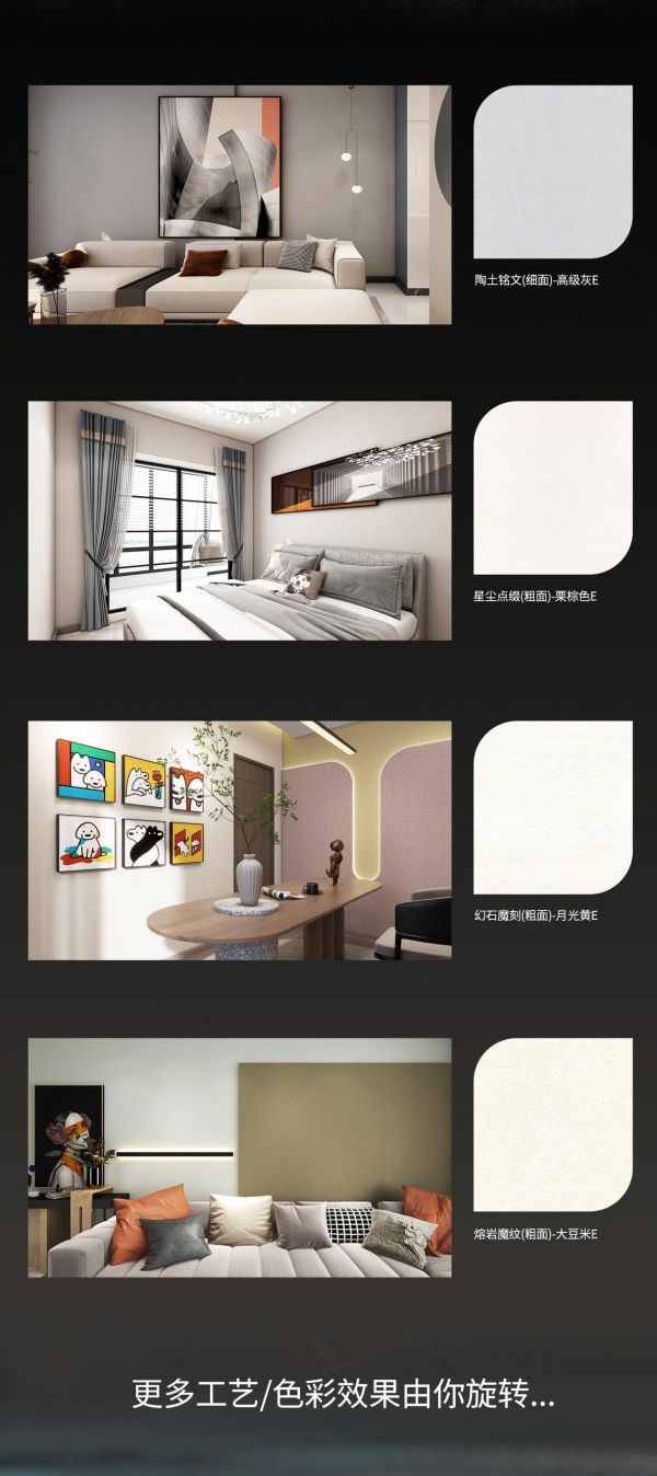 √ 粗面+细面:解锁空间无限剧本,雪砂幻影、玄武岩理、时空织锦、量子蚀刻、燧石映画、幻彩石刻、幻石魔刻、像素梦境、星尘点缀、陶土铭文、熔岩魔纹、鎏金叠影…模拟魔方72+面层艺术效果,满足不同空间装饰风格的个性定制;