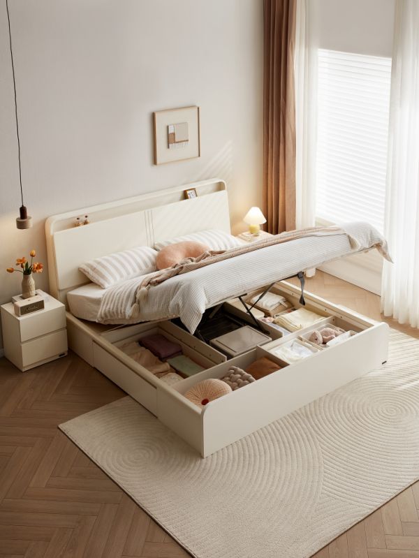 全友好梦储物床,卧室里的温柔收纳师。床头集插头、USB接口与置物架于一体,充电储物两不误。自带柔光小夜灯带,轻触开关即亮,操作便捷贴心。下翻柜门内藏多格收纳,杂物有序安放;床底上翻式大空间,棉被行李轻松收纳。省力压杆设计,开合顺畅无阻,支撑稳固,小力气也能轻松操作,收纳从此变成轻松事。