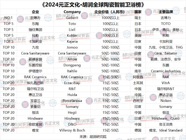 榜单显示,瑞士企业吉博力以超千亿估值位列第一;日本东陶和骊住、美国科勒,以及印度卡加利亚紧随其后,占据榜单前五名,中国成为上榜企业最多的国家,达7家,九牧、箭牌、东鹏位居榜单前十名,企业价值超50亿;瑞尔特、惠达、恒洁、帝欧跻身榜单前二十名,企业价值超15亿。