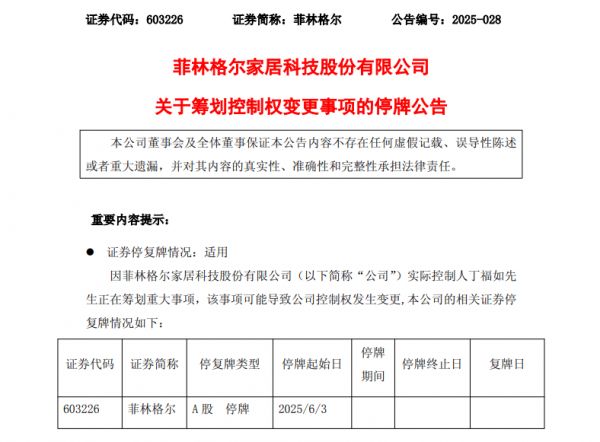 菲林格尔近日发布公告称,公司实际控制人丁福如正在筹划公司股份协议转让事宜,该事项可能导致公司控制权发生变更,股票将于6月3日开市起停牌,停牌时间不超过2个交易日。