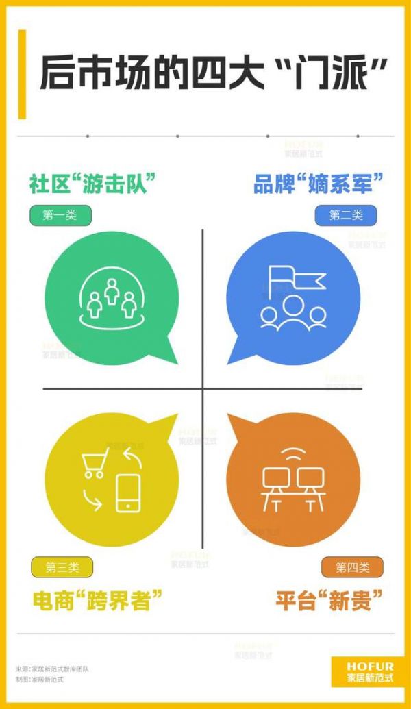 后市场的四大“门派”:平台模式重构竞争格局家居服务江湖中,不同类型的玩家带着各自基因跑马圈地,形成四类鲜明的“生存范式”。