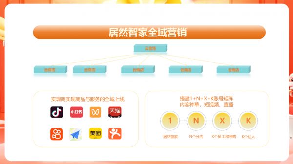 在抖音平台成功运营后,居然智家迅速总结经验,投向更广阔的全域生态,打造“1+N+X+K”全域运营矩阵。“1”个中枢,既以居然之家强大的品牌势能、供应链整合能力及线下数百家实体商场为根基;搭建“N”个核心阵地,既是全国的庞大实体商场网络,也是全域战略落地的关键节点与属地化作战单元,更是线上流量承接、服务落地、体验升级的核心载体;发动“X”个作战主体,既居然智家的营销团队、场内生态伙伴和数万名的一线金牌导购和设计师,通过新媒体陪跑和专业的技能培训,化身主播和短视频创造者进行线上内容种草,他们是最了解产品、最贴近本地客户的“超级销售员”和“生活顾问”,极大增强了内容的可信度与亲和力;联动“K”个达人声量,既合作垂直领域(家装、设计、生活美学)和本地生活的达人力量,通过探店直播、专业测评、场景化种草短视频等形式,借力其专业背书和粉丝影响力,触达更广泛的目标人群,提升品牌声量。