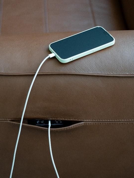 扶手外侧设有隐藏式控制面板,便于调节沙发功能,同时保持整体外观的简洁。面板配备USB-C充电接口,方便为设备充电。所有电缆和电机组件巧妙地隐藏于沙发结构中,避免外露,与皮面浑然一体。