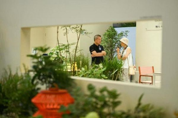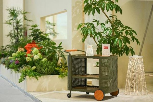 展台整体架构出都市庭院轮廓,踏入庭院,花草馥郁,藤织、金属与纺织品的质感交错,自然元素与之细腻呼应,松弛与闲适的氛围如影随形。