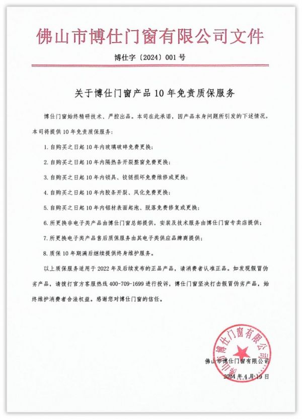 博仕门窗总部推出的“十年免定责质保”品质承诺 ,覆盖型材、五金件、玻璃等核心部件,提供十年免定责期限损坏免费维修更换服务。其重点在于不追究责任,在质保期内无论天灾人祸,均在质保范围中。超耐用的品质是用户信任的基础,好口碑自然而生,对经销商而言,免定责质保条款减少售后沟通成本,能更专注前端销售;对用户而言,长期质保消除使用顾虑,提升消费决策信心。