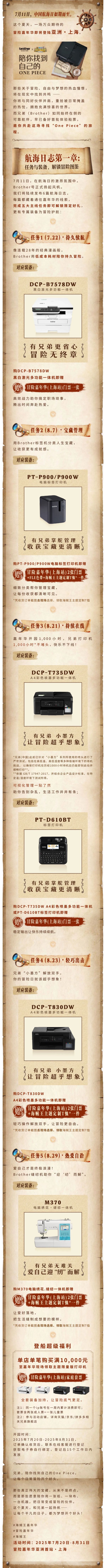 值得一提的是,兄弟(Brother)品牌化身可靠航伴,精心筹备了首批体验船票,诚邀广大冒险爱好者登上“Brother号”,共赴这场寻找“One Piece”的梦幻之旅。7月11日起,Brother号正式扬帆起航,更多精彩活动与惊喜好礼正等待着大家开启。