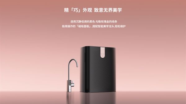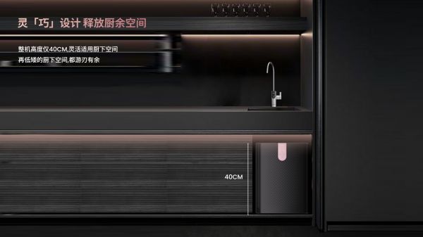 灵泷X Pro以轻盈机身隐于橱下,黑色面板搭配晶格纹理,点缀玫瑰金色线条,大气不凡。整机小巧,仅有40cm, 有限空间中演绎无限净水可能,赋予现代家居独特简约美感。
