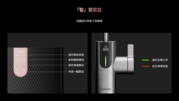 产品采用创新的双显示屏设计:升级版智能龙头配备高清液晶显示屏,实时显示水质TDS值和单次用水量;机身智能屏显,同步显示原水水质和滤芯状态。