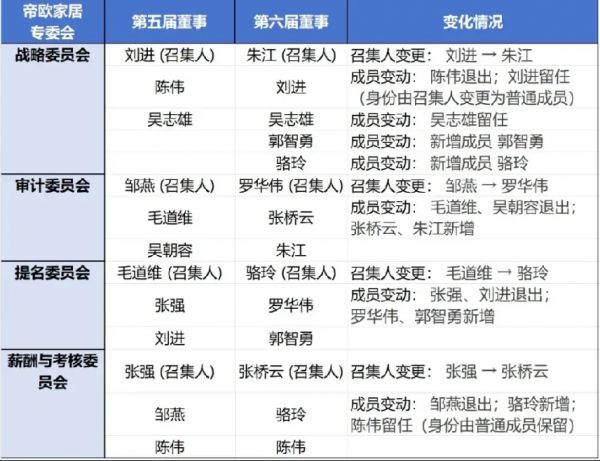2025年7月10日,帝欧家居召开2025年第二次临时股东会,审议通过《关于董事会换届选举非独立董事的议案》《关于董事会换届选举独立董事的议案》,公司董事会已顺利完成换届选举。同日,帝欧家居召开第六届董事会第一次会议,审议通过《关于选举公司第六届董事会董事长的议案》《关于选举公司第六届董事会副董事长的议案》《关于选举公司第六届董事会专门委员会成员的议案》《关于聘任公司总裁的议案》《关于聘任公司副总裁的议案》《关于聘任公司财务总监的议案》《关于聘任公司董事会秘书的议案》《关于聘任公司内审负责人的议案》《关于聘任公司证券事务代表的议案》。赘述完官方辞令后,不难发信帝欧家居第六届董事会已与“换血”无异,其下属四个专门委员会,除了陈伟和吴志雄作为朱江的一致行动人继续留任外,其余原有成员几乎都不见了踪影。至于原有的监事会,依据新《公司法》已被审计委员会替代职能。这里或许有人不解,为什么监事会这么一个经常由职工代表出任、监督董事会议事的重要职能部门会被取代?这里特别说明一下,虽然股份有限公司原则上必须设立监事会,但如果公司在董事会中设立了由董事组成的审计委员会,且该审计委员会行使了《公司法》规定的监事会职权(主要是财务监督权),那么公司可以不设监事会或监事,不过国有独资企业例外。索性,帝欧家居并非国企背景。
