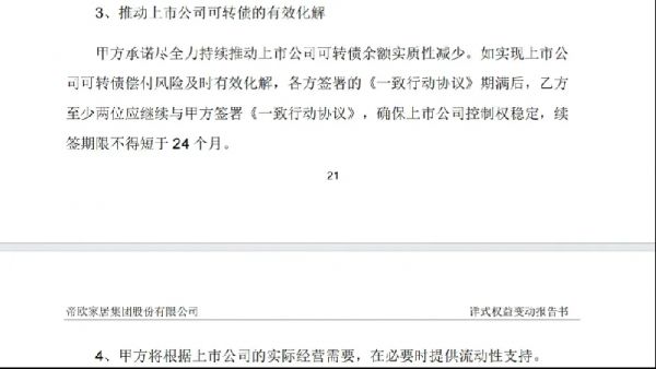 在彼时帝欧家居的披露的权益变动报告书也佐证了上述观点,战略协议中明确提及:“甲方(朱江)承诺尽全力持续推动上市公司可转债余额实质性减少。如实现上市公司可转债(帝欧转债)偿付风险及时有效化解,各方签署的《一致行动协议》期满后,乙方(刘进/陈伟/吴志雄)至少两位应继续与甲方签署《一致行动协议》,确保上市公司控制权稳定,续签期限不得短于24个月。并且,甲方将根据上市公司的实际经营需要,在必要时提供流动性支持。”