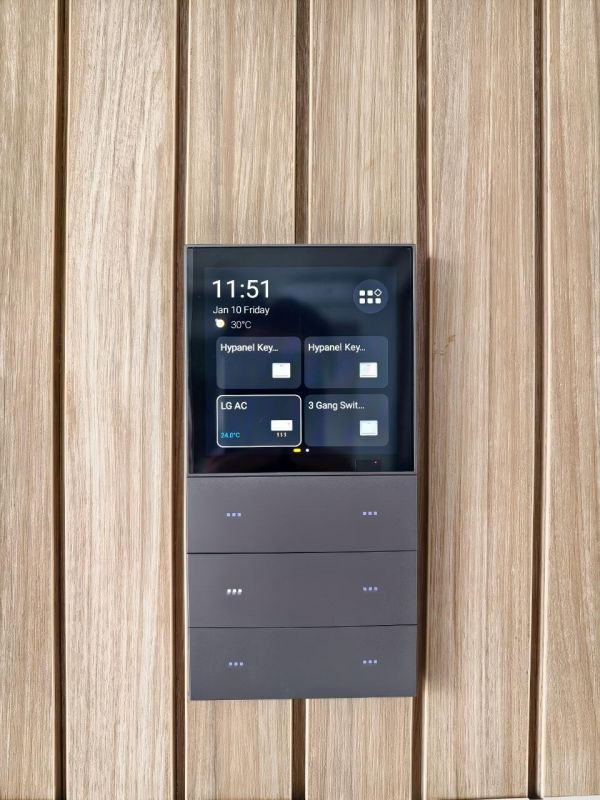 六键智能中控HyPanel KeyPlus作为别墅的全能指挥家,支持有线连接互联网,通过手机App远程控制灯光、窗帘、室温等,并兼容第三方摄像头。