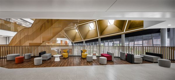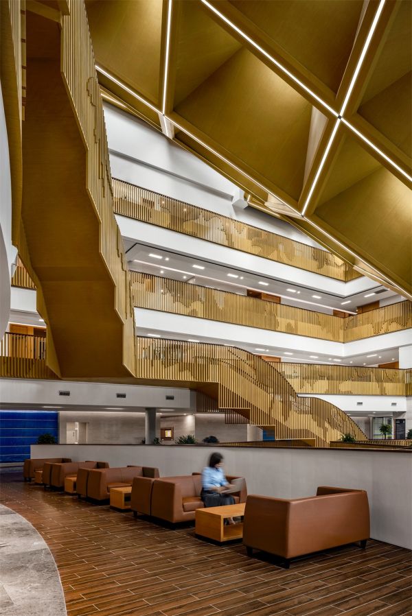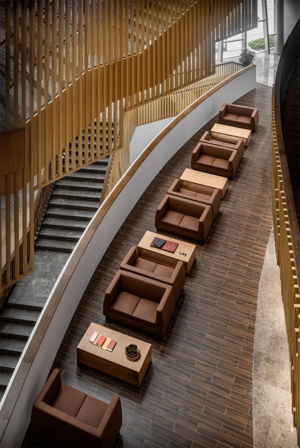 项目的另一处亮点是中庭空间,错落有致的钛合金光顶造型,在阳光下似霞光环绕。转折承起的异形楼梯寓意着“知识阶梯”,给人们留下了深刻的第一印象,搭配Mousse沙发和茶几,吸引着访客们落座闲谈,呈现了一个端庄、谦逊和舒适的接待洽谈空间。
