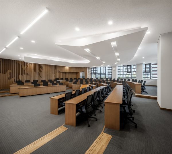 在教学区的部分,震旦打造约60人规模的智能教室,采用环抱式桌椅,支持互动式教学。桌椅采用弧形排布,空间宽松,视野开阔,搭配投屏设备,激发着新思维、新视角和新想法在这里不断涌现。