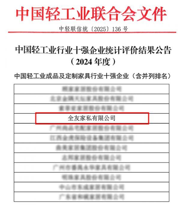喜讯!全友家居荣获中国轻工业双项权威认证