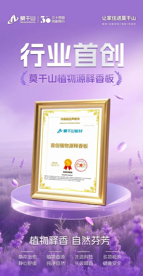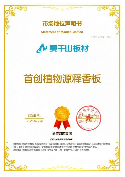 当家居消费从“功能需求”转向“情绪价值”,莫干山板材以植物源技术交出了一份创新答卷。近日,尚普咨询正式认证莫干山板材“首创植物源释香板”身份,并出具《市场地位声明书》。这一认证不仅标志着云峰莫干山在板材功能创新上的领跑地位,更为家居行业开辟了“功能+情绪”的全新赛道。