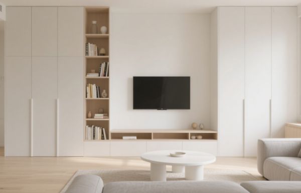 ·小户型:推荐浅色系高柜体设计,利用垂直空间增加收纳,板材轻量化特性降低空间压抑感;
