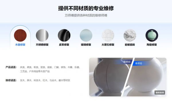 以破损修复服务为例,平台将维修师傅分别对应成漆面修复、开裂修复、断裂修复、覆膜鼓包修复、榫卯结构修复、红木家具修复、影木修复等超200种细分维修技能。无论故障问题描述得如何详细具象,万师傅都能实现精准匹配,实时满足用户需求。