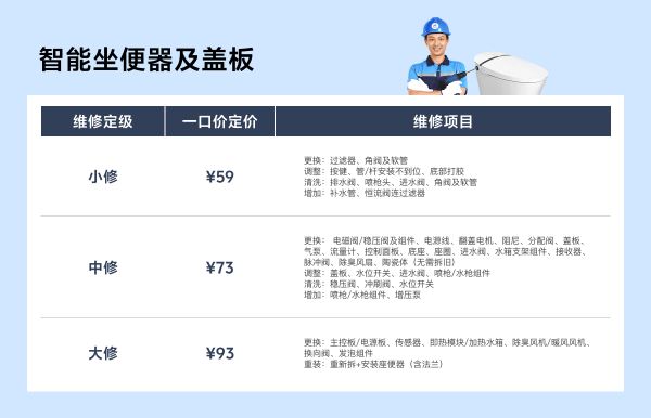 如智能坐便器大中小修的价格分别为59元、73元、93元,家具更换配件一口价为60元。