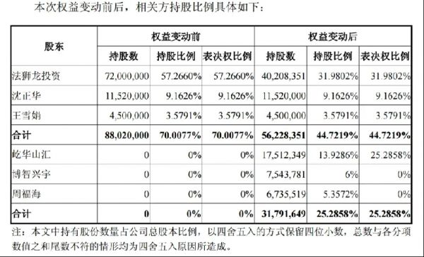 法狮龙实控人未变股权转让后,法狮龙原实控人阵营(法狮龙投资控股有限公司+沈正华+王雪娟)持股比例从70.01%降至44.72%, 但仍牢牢掌握公司控制权。新股东组合(屹华山汇+周福海+博智兴宇)合计持股 25.29%。其中, 屹华山汇作为领投方,斥资约4.66亿,拿下 13.93% 股权;跟投方周福海(自然人)出资约1.79亿,获得 5.36% 股权;跟投方B博智兴宇(私募基金)出资约2.01亿,获得 6% 股权。三方合计出资 8.46亿元,受让法狮龙 25.29% 的股份(共31,791,649股),每股作价 26.62元。屹华山汇、周福海、博智兴宇共同承诺,本次受让的股份在完成过户登记后 24个月内不减持,显示长期看好姿态。法狮龙强调公司实际控制人未因股权转让而变更,且本次转让不影响其在人员、资产、财务、业务、机构等方面的独立性,日常运营照常。