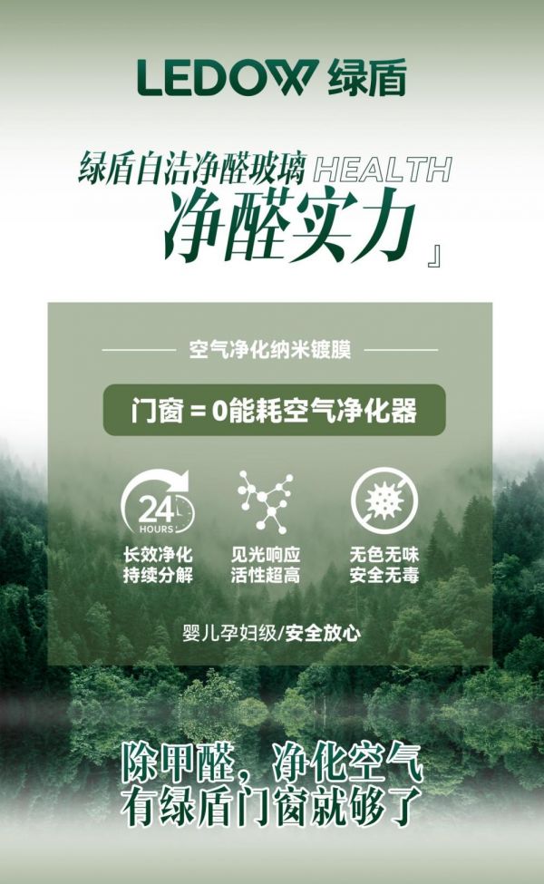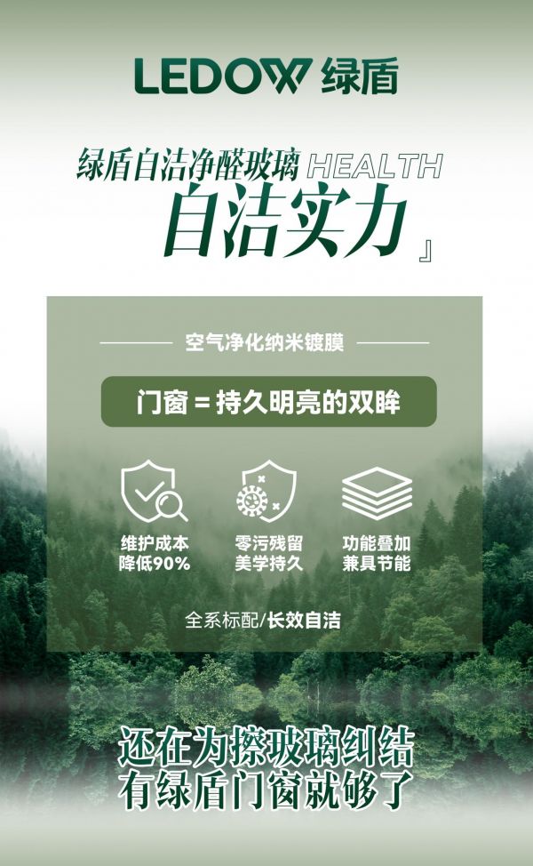 绿盾自洁净醛玻璃的诞生,精准击中了当代生活的两大焦虑:高层建筑外窗清洁的高成本与高风险,以及新装修家庭面临的甲醛污染隐患。通过将门窗升级为“会呼吸的生态屏障”,绿盾让建筑表皮具备了自我净化与空气治理的能力。