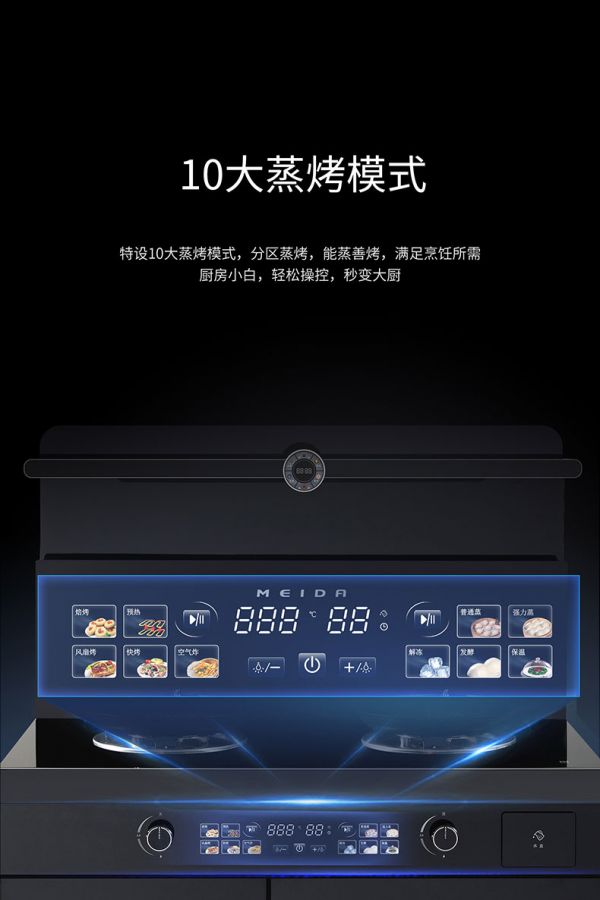 更令人惊喜的是隐藏在灶具下方的高效烹饪空间。美大巧妙地将传统消毒柜位置升级为灵活模块,用户可依据需求自由选配蒸箱、烤箱或消毒柜。这并非简单叠加,而是专业级烹饪设备的集成。大容量蒸箱,120℃高温蒸汽包裹食材,极速渗透锁住鲜嫩;精准控温烤箱,热力均匀分布,烤出外酥里嫩的风味。无需额外购买占地方的小家电,专业烹饪需求已被这台集成灶轻松囊括。