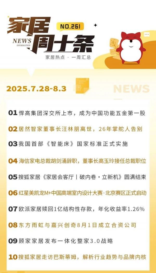 家居周十条丨悍高集团深交所挂牌上市、我国首部《智能床》国家标准正式实施…